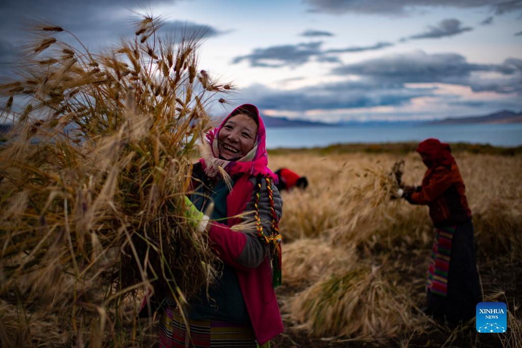 Villagers harvest highland barley at Ombu Township, Nyima County, Nagqu City of southwest China's Tibet Autonomous Region, Sept. 23, 2021. In the plateau county of Nyima, the yearly average temperature stays at minus four degrees Celsius and herding is the main walk of life for most of its residents. But there is one exception -- Ombu Township where two major lakes, Tangra Yumco and Tangqung Co, help create a rare climate for farming in the grasslands. It is also a reason behind such a vast field of highland barley, rarely seen in north Tibet. (Xinhua/Purbu Zhaxi)