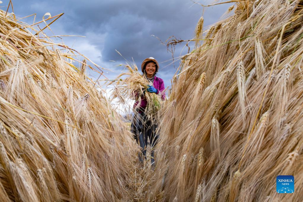 - Farmers harvest highland barley in Lhasa, Tibet
