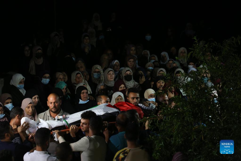 People carry the body of Palestinian man Mohammed Khbeisa during his funeral in the village of Beita, near the northern West Bank city of Nablus, on Sept. 24, 2021. A Palestinian man was killed and dozens were injured on Friday in clashes between Palestinian protesters and Israeli soldiers in the West Bank, medics and eyewitnesses said. Mohammed Khbeisa, 28 years old, was killed by Israeli soldiers during clashes in the village of Beita, the Palestinian Ministry of Health said in a statement. (Photo by Nidal Eshtayeh/Xinhua)