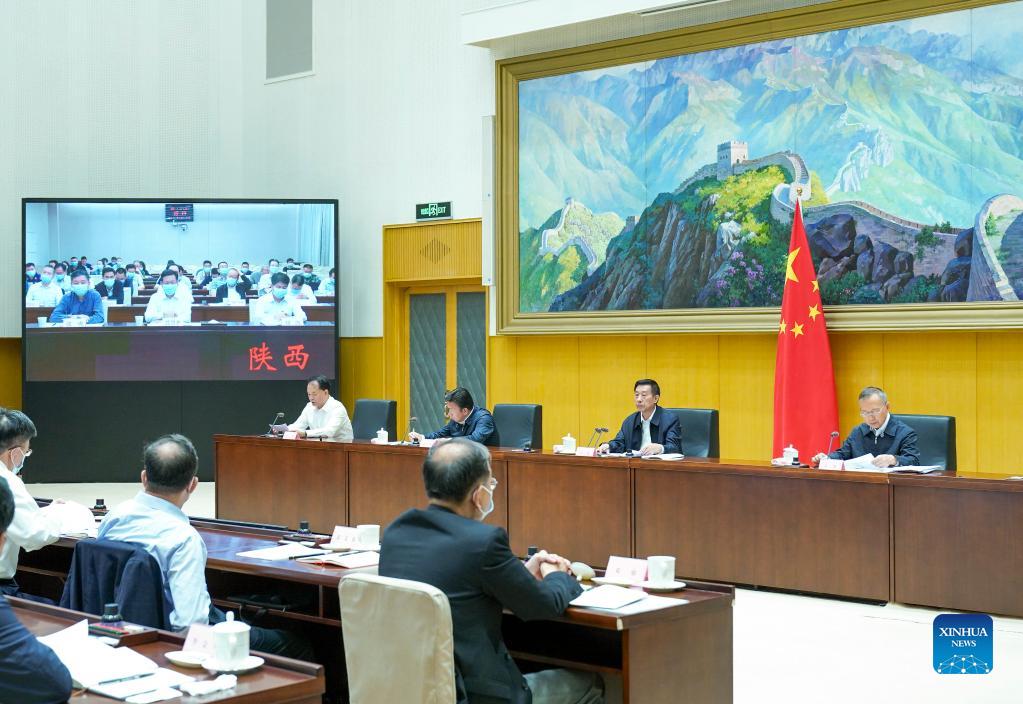 Chinese State Councilor Wang Yong, also head of the national headquarters of forest and grassland fire prevention and control, attends a national teleconference on forest and grassland fire prevention and control in Beijing, capital of China, Sept. 24, 2021. (Xinhua/Gao Jie)