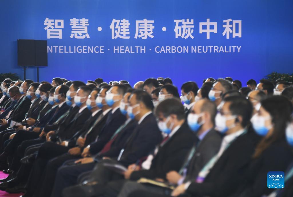 Photo taken on Sept. 24, 2021 shows a scene of the opening ceremony of the 2021 Zhongguancun Forum in Beijing, capital of China. The 2021 Zhongguancun Forum, which opened here on Friday under the theme of "intelligence, health, and carbon neutrality," is scheduled from Sept. 24 to 28. (Xinhua/Ren Chao)