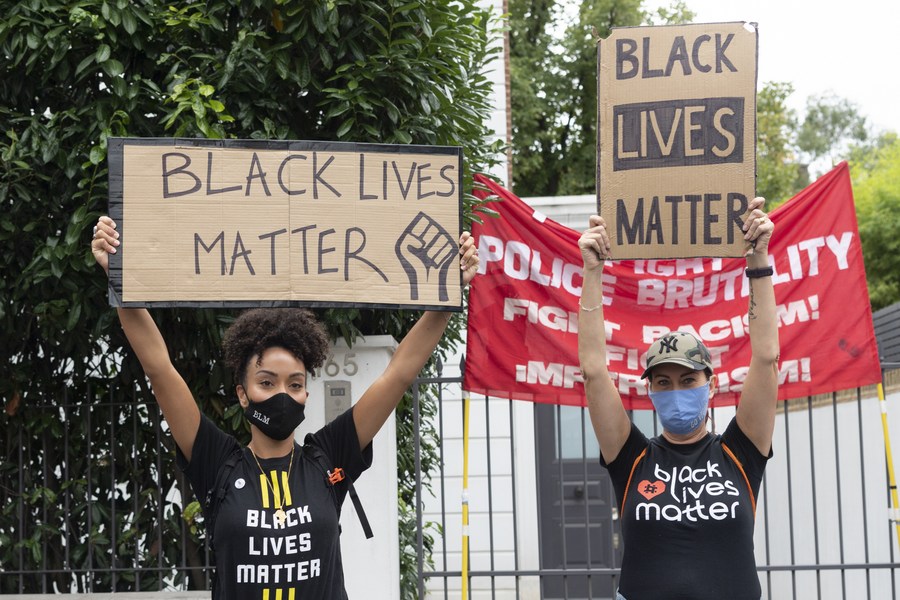 Protesters hold placards with anti-racism messages during the Million People March demonstration to protest against systemic racism in the UK in London, Britain, Aug. 30, 2020. (Photo by Ray Tang/Xinhua)