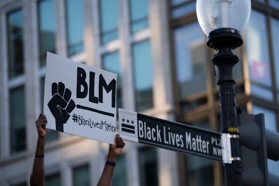 Photo taken on June 8, 2020 shows a protester holding a sign that reads "Black Lives Matter" near the White House during a demonstration over the death of George Floyd in Washington D.C., the United States. (Xinhua/Liu Jie)