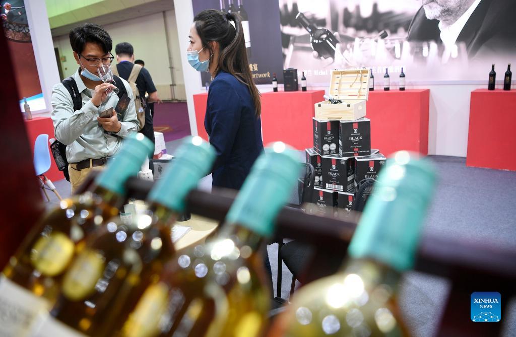 A participant (L) tastes wine at the first China (Ningxia) International Wine Culture and Tourism Expo in Yinchuan, northwest China's Ningxia Hui Autonomous Region, Sept. 25, 2021. The first China (Ningxia) International Wine Culture and Tourism Expo is held from Sept. 25 to 27. (Xinhua/Wang Peng)