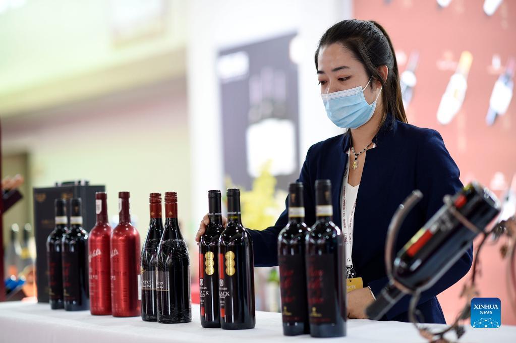 An exhibitor prepares wine at the first China (Ningxia) International Wine Culture and Tourism Expo in Yinchuan, northwest China's Ningxia Hui Autonomous Region, Sept. 25, 2021. The first China (Ningxia) International Wine Culture and Tourism Expo is held from Sept. 25 to 27. (Xinhua/Wang Peng)
