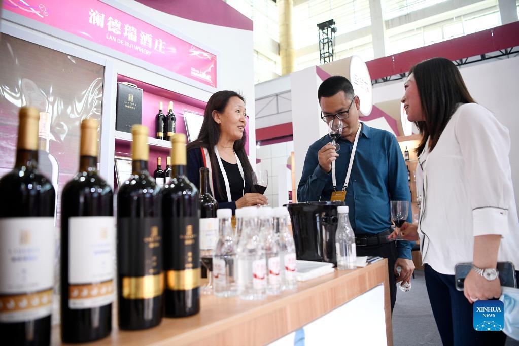 Participants taste wine at the first China (Ningxia) International Wine Culture and Tourism Expo in Yinchuan, northwest China's Ningxia Hui Autonomous Region, Sept. 25, 2021. The first China (Ningxia) International Wine Culture and Tourism Expo is held from Sept. 25 to 27. (Xinhua/Wang Peng)