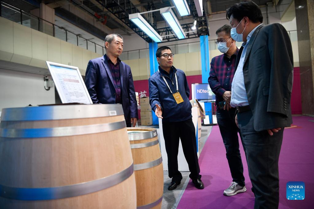 An exhibitor (2nd L) introduces wooden barrels at the first China (Ningxia) International Wine Culture and Tourism Expo in Yinchuan, northwest China's Ningxia Hui Autonomous Region, Sept. 25, 2021. The first China (Ningxia) International Wine Culture and Tourism Expo is held from Sept. 25 to 27. (Xinhua/Wang Peng)