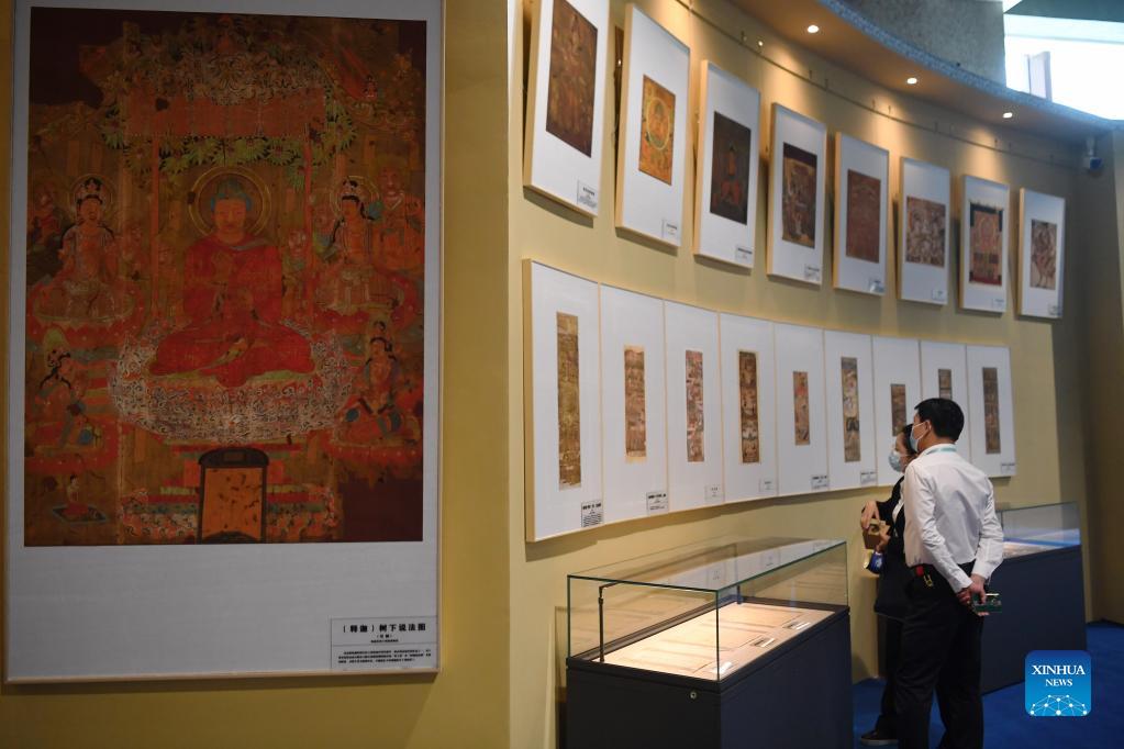 People visit an exhibition of the duplications of Dunhuang overseas fine cultural relics in Dunhuang City, northwest China's Gansu Province, Sept. 24, 2021. The exhibition is one of the main exhibitions of the 5th China Silk Road (Dunhuang) International Cultural Expo and the 10th Dunhuang Tour-Silk Road International Tourism Festival, which kicked off Friday in Dunhuang, a major hub on the ancient Silk Road in northwest China's Gansu Province. A total of 200 replicas of Dunhuang's cultural relics scattered overseas were displayed. (Xinhua/Chen Bin)