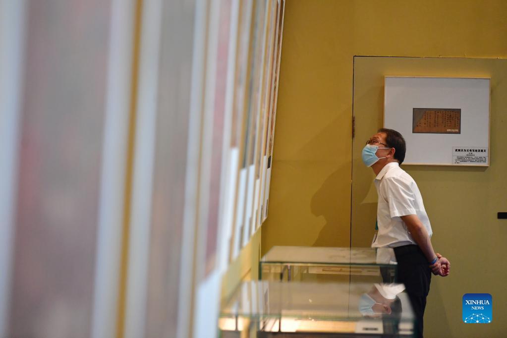 A man visits an exhibition of the duplications of Dunhuang overseas fine cultural relics in Dunhuang City, northwest China's Gansu Province, Sept. 24, 2021. The exhibition is one of the main exhibitions of the 5th China Silk Road (Dunhuang) International Cultural Expo and the 10th Dunhuang Tour-Silk Road International Tourism Festival, which kicked off Friday in Dunhuang, a major hub on the ancient Silk Road in northwest China's Gansu Province. A total of 200 replicas of Dunhuang's cultural relics scattered overseas were displayed. (Xinhua/Chen Bin)
