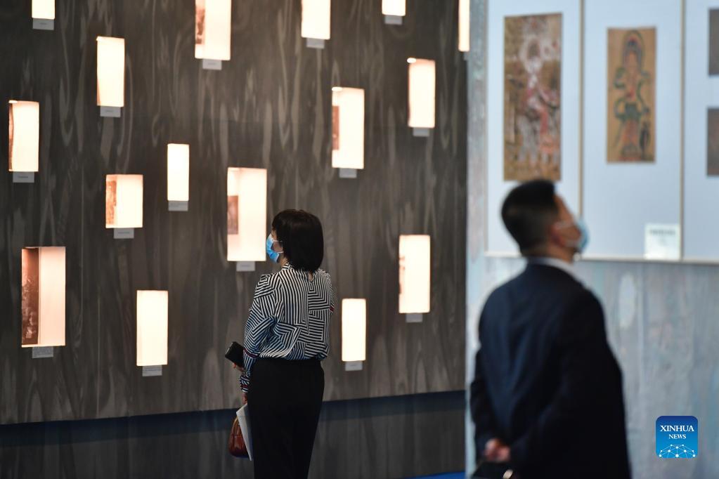 People visit an exhibition of the duplications of Dunhuang overseas fine cultural relics in Dunhuang City, northwest China's Gansu Province, Sept. 24, 2021. The exhibition is one of the main exhibitions of the 5th China Silk Road (Dunhuang) International Cultural Expo and the 10th Dunhuang Tour-Silk Road International Tourism Festival, which kicked off Friday in Dunhuang, a major hub on the ancient Silk Road in northwest China's Gansu Province. A total of 200 replicas of Dunhuang's cultural relics scattered overseas were displayed. (Xinhua/Chen Bin)
