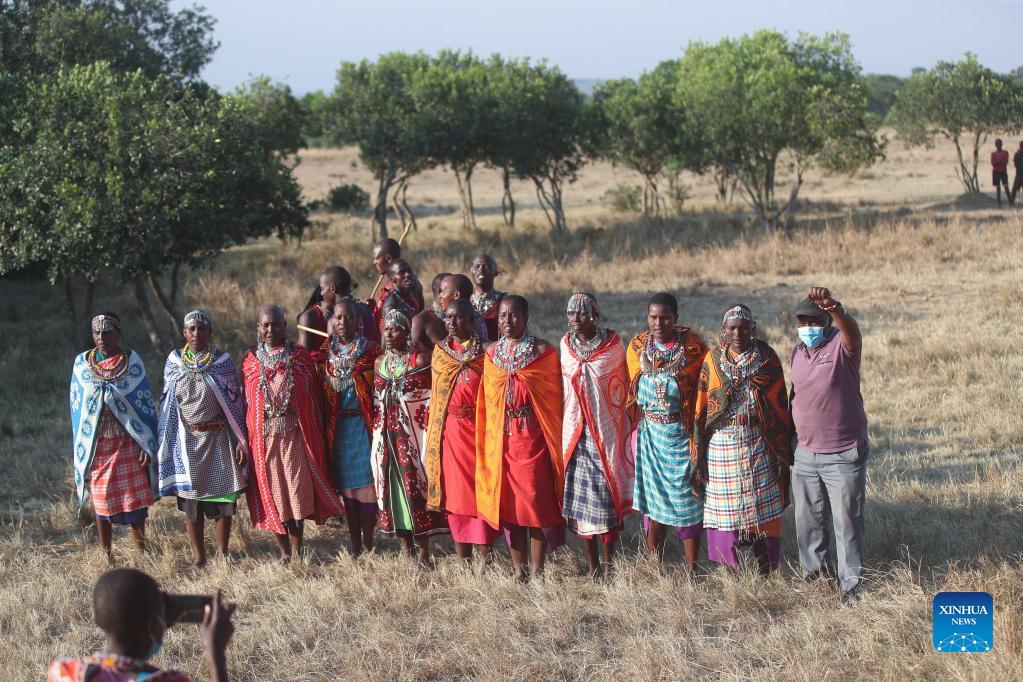 Maasai people pose for photos with tourists at Maasai tribe near the Maasai Mara National Reserve, Kenya, Aug. 29, 2021. (Xinhua/Long Lei)