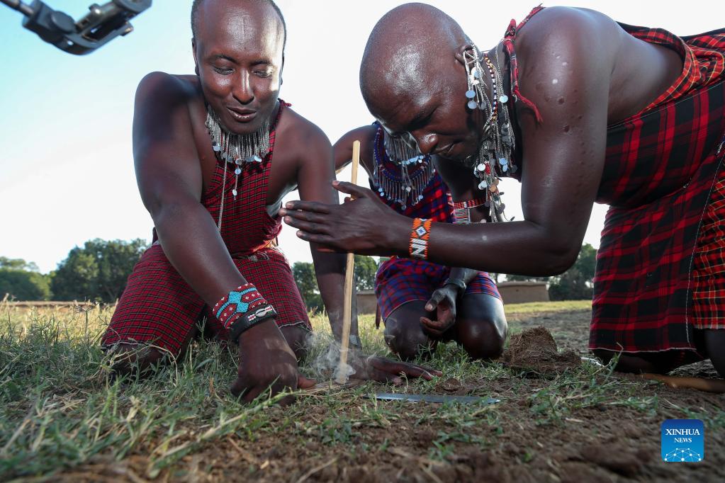 Maasai people demonstrate drilling wood to make fire at Maasai tribe near the Maasai Mara National Reserve, Kenya, Aug. 29, 2021. (Xinhua/Long Lei)