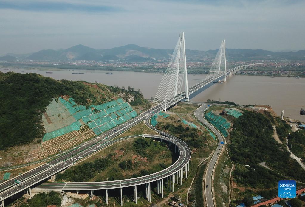 Aerial photo taken on Sept. 25, 2021 shows the Wuxue Yangtze River road bridge in central China's Hubei Province. Two new bridges over the Yangtze River opened to traffic Saturday in central China's Hubei Province. With a total length of 31 km and an 808-meter-long main span, the Wuxue Yangtze River road bridge links Wuxue City with Yangxin County of Huangshi City. The bridge has six lanes with a designed speed of 100 kph. The 11.2-km Chibi Yangtze River road bridge, with a 720-meter-long main span, shortened the vehicular travel time between Chibi City and Honghu City to five minutes. The new bridges are expected to improve the expressway network in Hubei and promote the development of urban clusters in the middle reaches of the Yangtze River. (Xinhua/Cheng Min)
