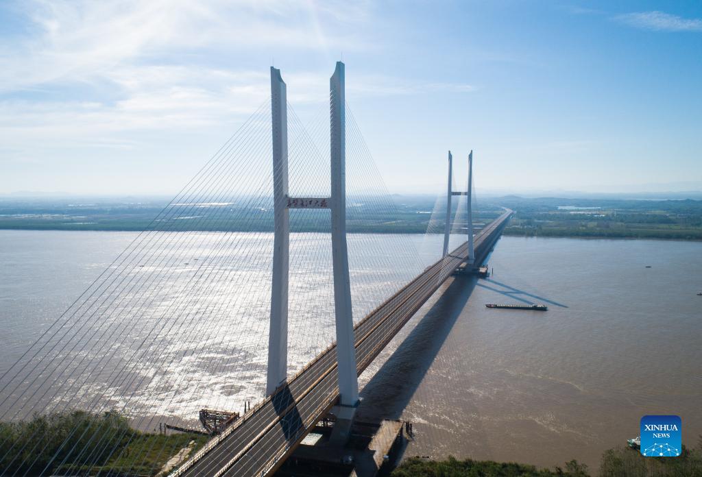 Aerial photo taken on Sept. 25, 2021 shows the Chibi Yangtze River road bridge in central China's Hubei Province. Two new bridges over the Yangtze River opened to traffic Saturday in central China's Hubei Province. With a total length of 31 km and an 808-meter-long main span, the Wuxue Yangtze River road bridge links Wuxue City with Yangxin County of Huangshi City. The bridge has six lanes with a designed speed of 100 kph. The 11.2-km Chibi Yangtze River road bridge, with a 720-meter-long main span, shortened the vehicular travel time between Chibi City and Honghu City to five minutes. The new bridges are expected to improve the expressway network in Hubei and promote the development of urban clusters in the middle reaches of the Yangtze River. (Xinhua/Xiao Yijiu)