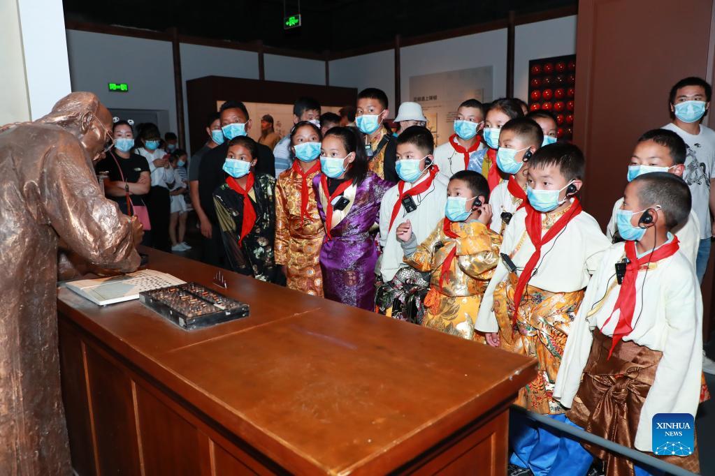 A group of students from Riwoqe County of southwest China's Tibet Autonomous Region visit the Chengdu Museum in Chengdu, southwest China's Sichuan Province, Sept. 23, 2021. At the beginning of this new semester, 15 Tibetan students, accompanied by their teachers, started a class trip sponsored by a student aid fund that rewards and supports students from poor families with excellent academic performance in Riwoqe County, southwest China's Tibet Autonomous Region. At the first stop of the project this year, the students visited Chengdu Museum and made some handicrafts. They will visit Beijing and Tianjin later during this year's trip. Since it was started in 2014, the public welfare project has benefited more than 100 students and teachers from 15 primary and middle schools in Riwoqe. (Xinhua/Tang Wenhao)