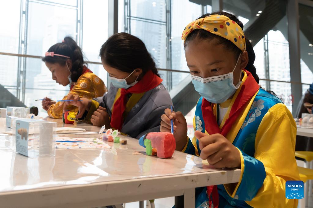A group of students from Riwoqe County of southwest China's Tibet Autonomous Region make handicrafts at the Chengdu Museum in Chengdu, southwest China's Sichuan Province, Sept. 23, 2021. At the beginning of this new semester, 15 Tibetan students, accompanied by their teachers, started a class trip sponsored by a student aid fund that rewards and supports students from poor families with excellent academic performance in Riwoqe County, southwest China's Tibet Autonomous Region. At the first stop of the project this year, the students visited Chengdu Museum and made some handicrafts. They will visit Beijing and Tianjin later during this year's trip. Since it was started in 2014, the public welfare project has benefited more than 100 students and teachers from 15 primary and middle schools in Riwoqe. (Xinhua/Tang Wenhao)