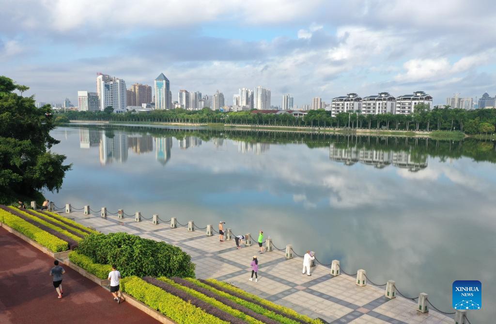 Aerial photo taken on Sept. 25, 2021 shows citizens exercising by Nanhu Lake in Nanning, capital of south China's Guangxi Zhuang Autonomous Region. (Xinhua/Lu Boan)