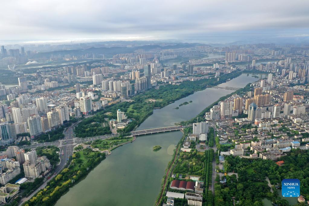 Aerial photo taken on Sept. 25, 2021 shows the view of Nanhu Lake in Nanning, capital of south China's Guangxi Zhuang Autonomous Region. (Xinhua/Lu Boan)