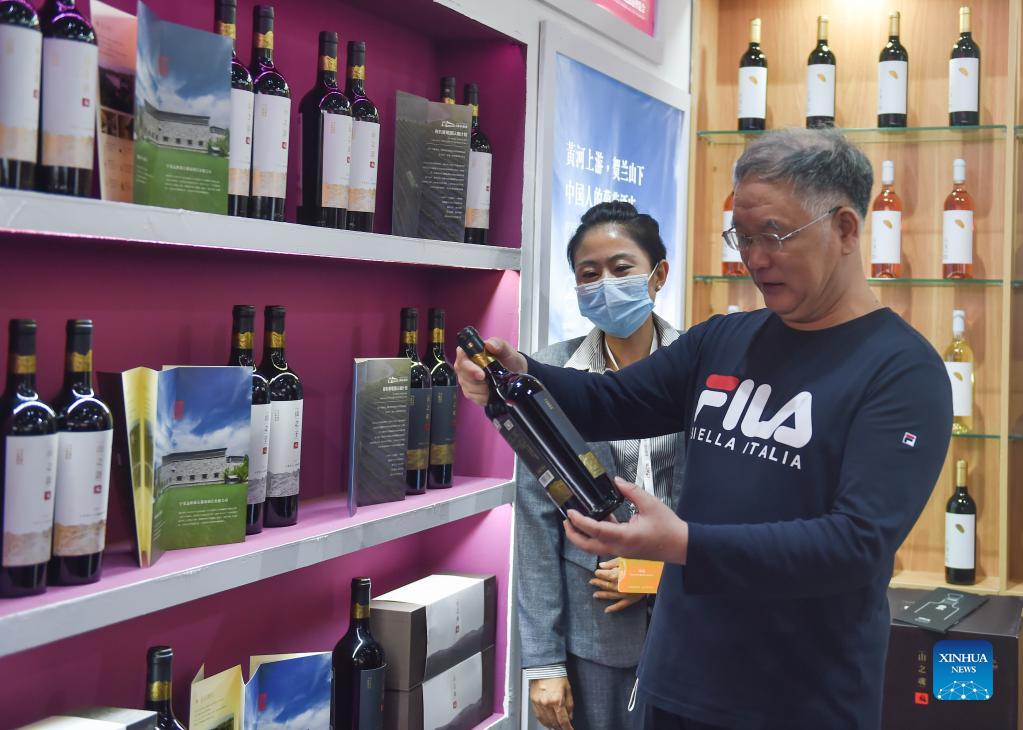 A visitor selects wine at the first China (Ningxia) International Wine Culture and Tourism Expo in Yinchuan, northwest China's Ningxia Hui Autonomous Region, Sept. 25, 2021. The first China (Ningxia) International Wine Culture and Tourism Expo is held from Sept. 25 to 27. (Xinhua/Tang Rufeng)