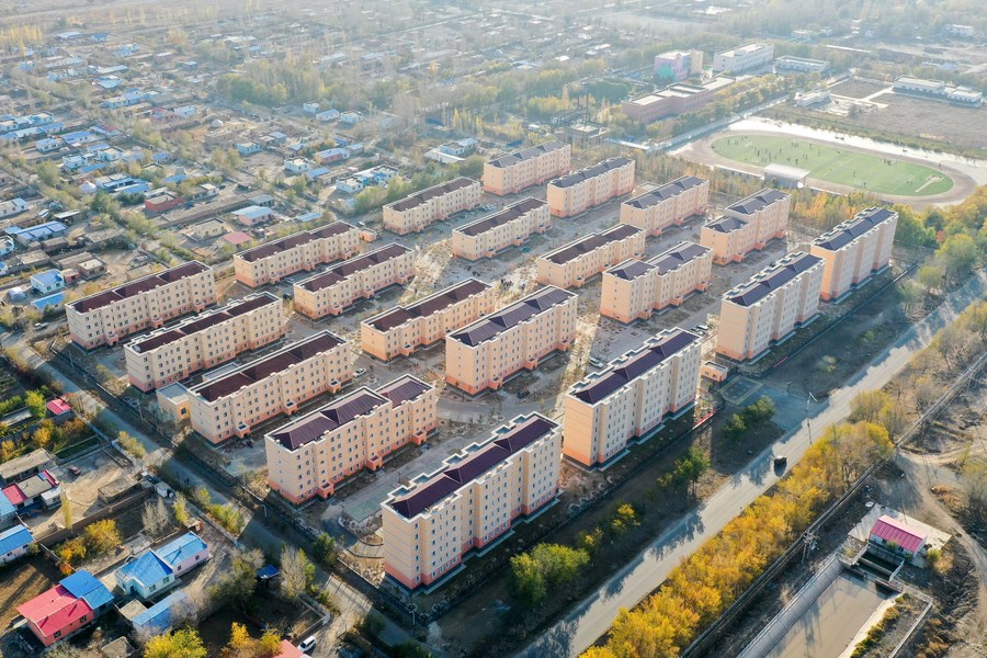 Aerial photo taken on Oct. 16, 2020 shows a residential area in Axili Town of Changji, northwest China's Xinjiang Uygur Autonomous Region. (Xinhua/Ding Lei)