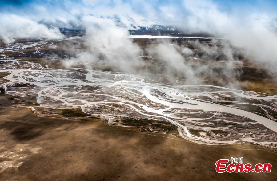 A bird's eye view of the cloud-shrouded Tongtian River, a main stream of the source of the Yangtze River in northwest China's Qinghai Province. (Photo/China News Service)