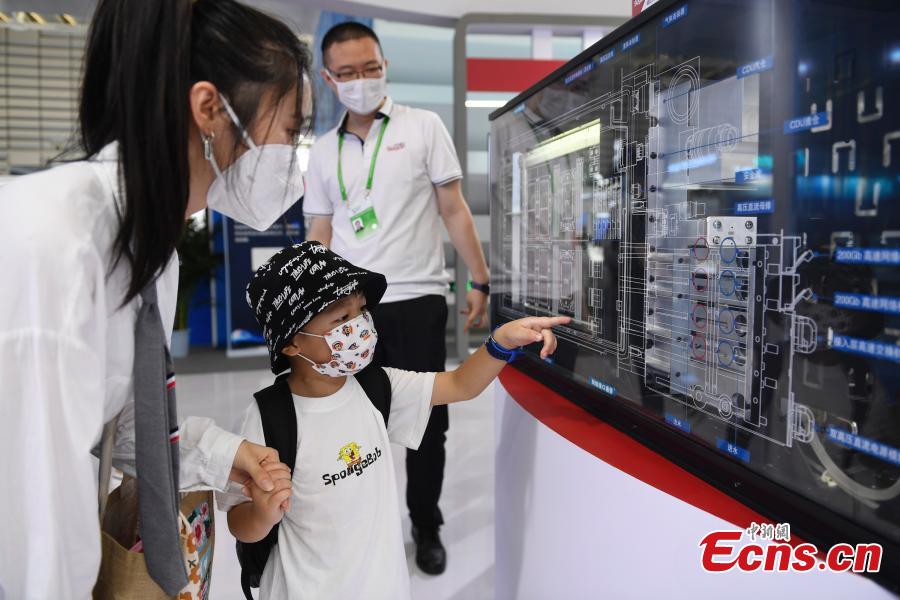 A child is attracted by a liquid immersion cooling computer main board during the Light of Internet Expo of the the 2021 World Internet Conference in Wuzhen, China’s Zhejiang Province, Sept. 26, 2021. (China News Service/Xu Shaofeng)