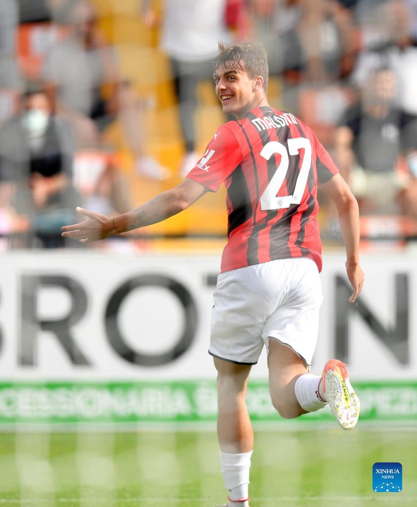 AC Milan's Daniel Maldini celebrates his goal during a Serie A football match between AC Milan and Spezia in La Spezia, Italy, on Sept. 25, 2021. (Photo by Daniele Mascolo/Xinhua)