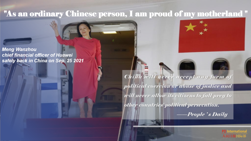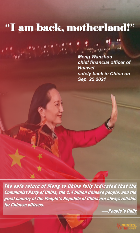 Chinese citizen Meng Wanzhou, arbitrarily detained by Canada on a U.S. extradition request on Dec. 1, 2018, at Vancouver International Airport, returned to China on a charter flight organized by the Chinese government on Sept. 25.