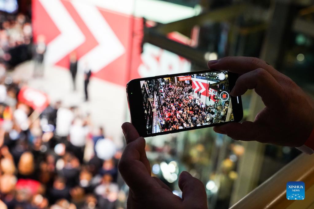 A participant takes video of a rally at the headquarters of Germany's Social Democratic Party (SPD) in Berlin, Germany, on Sept. 26, 2021. Germany's center-left Social Democratic Party led by the incumbent Vice Chancellor and Finance Minister Olaf Scholz, won about 26 percent of the vote in the federal election on Sunday, according to the preliminary exit poll released by German media ZDF. (Photo by Stefan Zeitz/Xinhua)