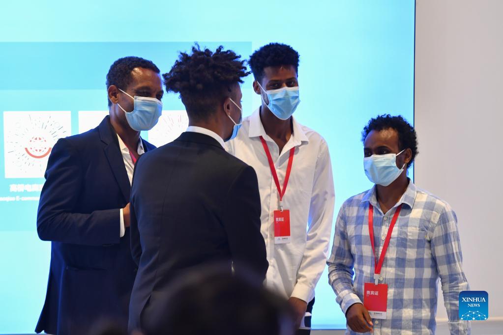Guests chat during the second China-Africa Economic and Trade Expo held in Changsha, central China's Hunan Province, Sept. 26, 2021. The four-day event, online and offline, themed "New Start, New Opportunities, and New Accomplishments," has attracted nearly 900 enterprises from nearly 40 African countries and China, according to the organizers. (Xinhua/Chen Zeguo)
