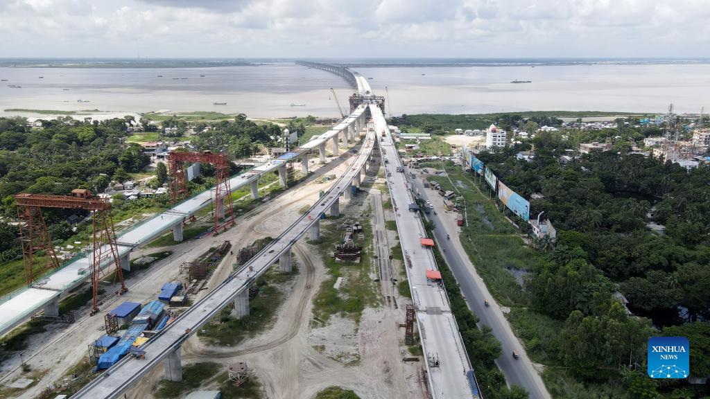 Aerial photo taken on July 18, 2021 shows a construction site of Padma Multipurpose Bridge Project in Munshiganj on the outskirts of Dhaka, Bangladesh. For Bangladeshis, a dream is coming true. The history of crossing the mighty Padma river between dozens of districts in southern Bangladesh and the capital of Dhaka only by ferries or boats is all set to end. The mega multipurpose road-rail bridge dubbed the "Dream Padma Bridge" of Bangladesh is nearing completion after workers overcame tons of hurdles, including challenges brought by the COVID-19 pandemic. The huge infrastructure, with the main bridge spanning 6.15 km in length, is undertaken by China Railway Major Bridge Engineering Group Co, Ltd (MBEC). It is the largest and most challenging infrastructure project in Bangladesh's history. (Xinhua)