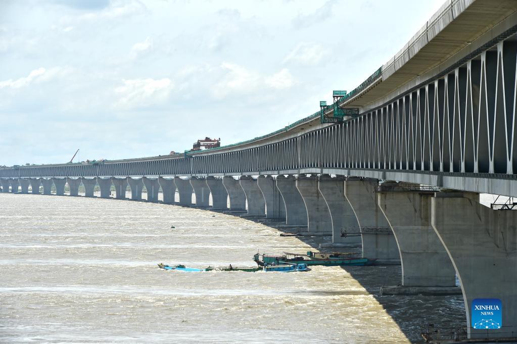 Photo taken on Sept. 12, 2021 shows a view of Padma Multipurpose Bridge Project under construction in Munshiganj on the outskirts of Dhaka, Bangladesh. For Bangladeshis, a dream is coming true. The history of crossing the mighty Padma river between dozens of districts in southern Bangladesh and the capital of Dhaka only by ferries or boats is all set to end. The mega multipurpose road-rail bridge dubbed the "Dream Padma Bridge" of Bangladesh is nearing completion after workers overcame tons of hurdles, including challenges brought by the COVID-19 pandemic. The huge infrastructure, with the main bridge spanning 6.15 km in length, is undertaken by China Railway Major Bridge Engineering Group Co, Ltd (MBEC). It is the largest and most challenging infrastructure project in Bangladesh's history. (Xinhua)