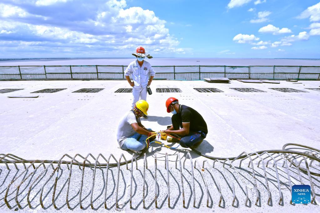 People work at a construction site of Padma Multipurpose Bridge Project in Munshiganj on the outskirts of Dhaka, Bangladesh, on Sept. 12, 2021. For Bangladeshis, a dream is coming true. The history of crossing the mighty Padma river between dozens of districts in southern Bangladesh and the capital of Dhaka only by ferries or boats is all set to end. The mega multipurpose road-rail bridge dubbed the "Dream Padma Bridge" of Bangladesh is nearing completion after workers overcame tons of hurdles, including challenges brought by the COVID-19 pandemic. The huge infrastructure, with the main bridge spanning 6.15 km in length, is undertaken by China Railway Major Bridge Engineering Group Co, Ltd (MBEC). It is the largest and most challenging infrastructure project in Bangladesh's history. (Xinhua)