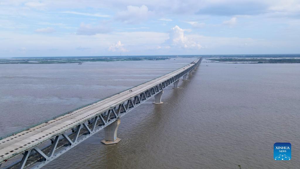 Aerial photo taken on Aug. 27, 2021 shows a view of Padma Multipurpose Bridge Project under construction in Munshiganj on the outskirts of Dhaka, Bangladesh. For Bangladeshis, a dream is coming true. The history of crossing the mighty Padma river between dozens of districts in southern Bangladesh and the capital of Dhaka only by ferries or boats is all set to end. The mega multipurpose road-rail bridge dubbed the "Dream Padma Bridge" of Bangladesh is nearing completion after workers overcame tons of hurdles, including challenges brought by the COVID-19 pandemic. The huge infrastructure, with the main bridge spanning 6.15 km in length, is undertaken by China Railway Major Bridge Engineering Group Co, Ltd (MBEC). It is the largest and most challenging infrastructure project in Bangladesh's history. (Xinhua)
