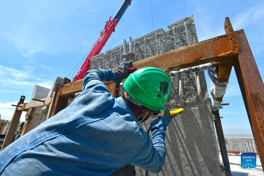 A worker works at a construction site of Padma Multipurpose Bridge Project in Munshiganj on the outskirts of Dhaka, Bangladesh, on Sept. 12, 2021. For Bangladeshis, a dream is coming true. The history of crossing the mighty Padma river between dozens of districts in southern Bangladesh and the capital of Dhaka only by ferries or boats is all set to end. The mega multipurpose road-rail bridge dubbed the "Dream Padma Bridge" of Bangladesh is nearing completion after workers overcame tons of hurdles, including challenges brought by the COVID-19 pandemic. The huge infrastructure, with the main bridge spanning 6.15 km in length, is undertaken by China Railway Major Bridge Engineering Group Co, Ltd (MBEC). It is the largest and most challenging infrastructure project in Bangladesh's history. (Xinhua)