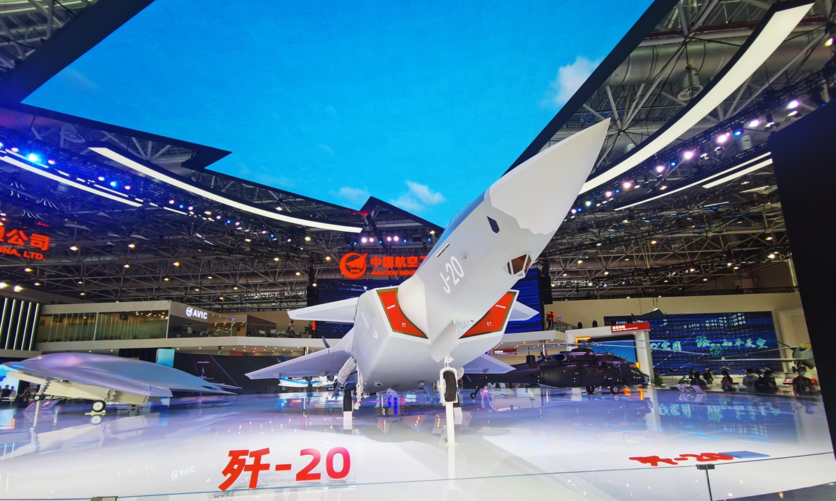 A model of a J-20 stealth fighter jet is on display at the exhibition stand of the Aviation Industry Corporation of China (AVIC), as the China Airshow 2021 in Zhuhai, South China's Guangdong Province, opened to media on Sunday. Models of other AVIC aircrafts of "20 family" including GJ-11 drone, Y-20 transport plane, FC-31 stealth fighter jet and Z-20 helicopter are also on display. (Photo: Yang Sheng/GT)