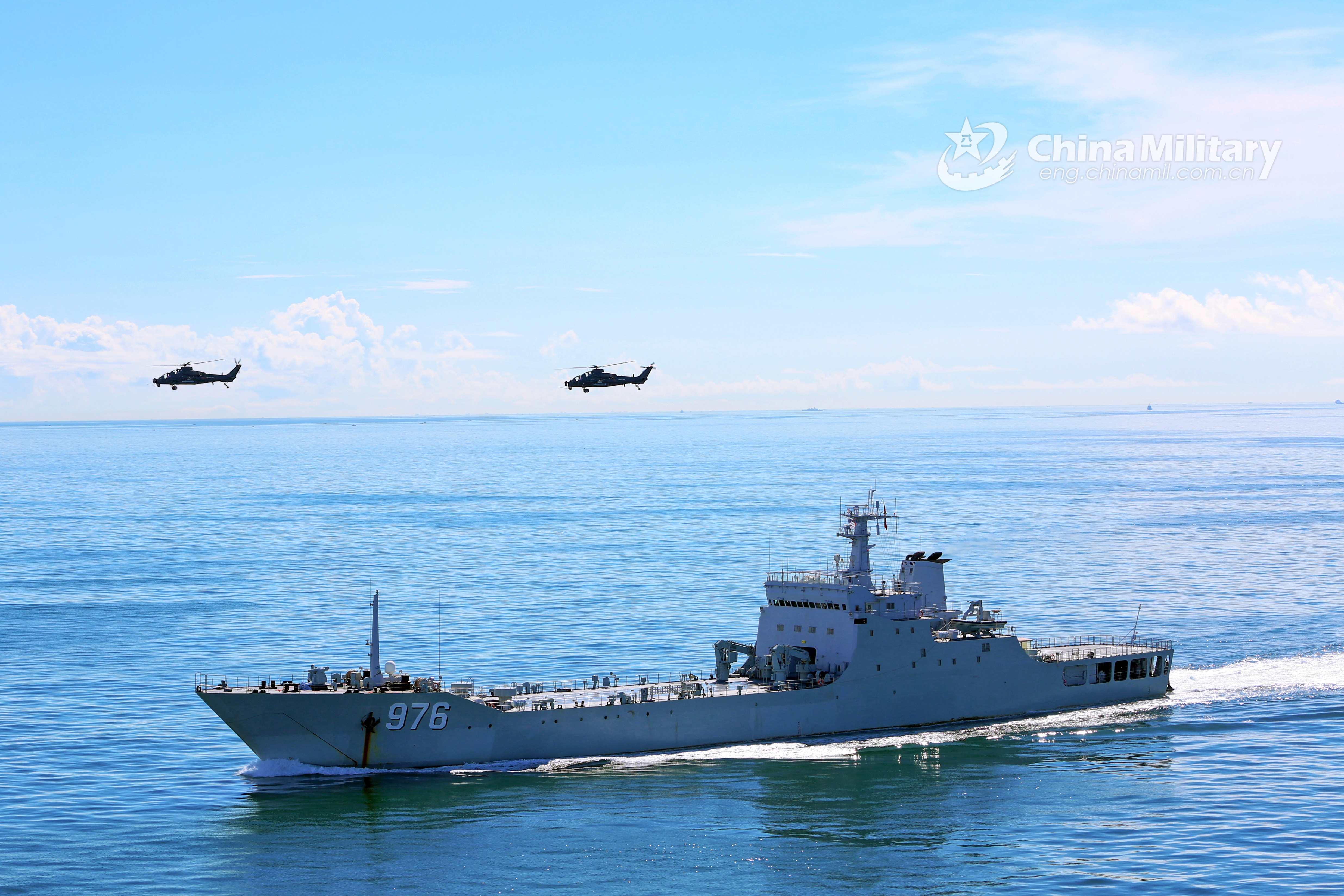 Two Mi-171 transport helicopters fly in same frequency with the landing ship Tianmushan (Hull 976) during a maritime coordinated training exercise in early September, 2021. The exercise was carried out by an army aviation brigade and a naval landing ship flotilla under the PLA Eastern Theater Command. (eng.chinamil.com.cn/Photo by Zhang Huanpeng)