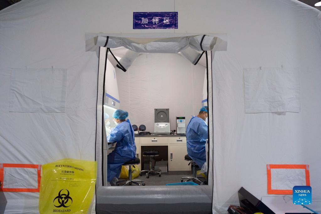 Medical workers work at a temporary lab for nucleic acid testing in Bayan County, Harbin of northeast China's Heilongjiang Province, Sept. 25, 2021. A total of three temporary labs for nucleic acid testing have been built in the county. (Xinhua/Xie Jianfei)