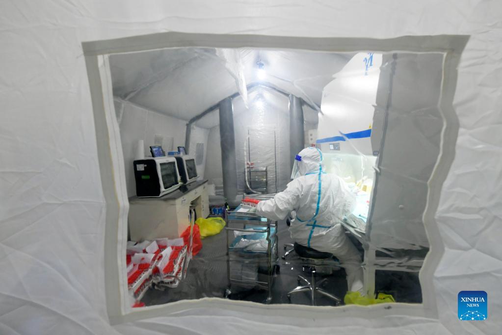 A medical worker works at a temporary lab for nucleic acid testing in Bayan County, Harbin of northeast China's Heilongjiang Province, Sept. 25, 2021. A total of three temporary labs for nucleic acid testing have been built in the county. (Xinhua/Wang Jianwei)