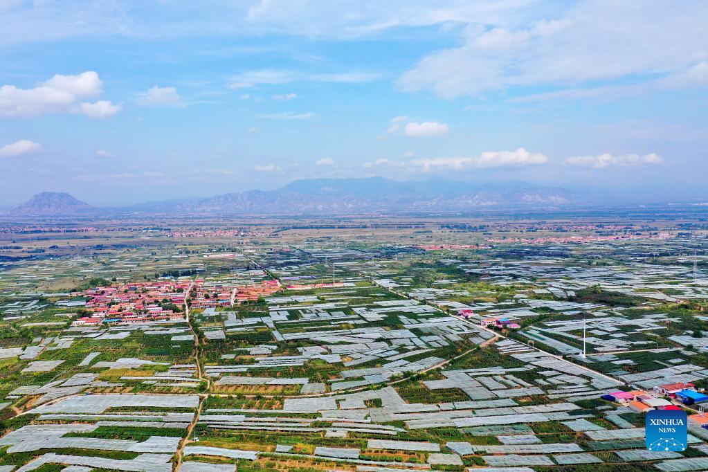 Aerial photo taken on Sept. 26, 2021 shows a grape planting base in Wenquantun Township, Zhuolu County, north China's Hebei Province. Autumn is the harvest season for grapes on the 80,000 mu (about 5,333 hectares) of grape fields in the county. (Xinhua/Mu Yu)