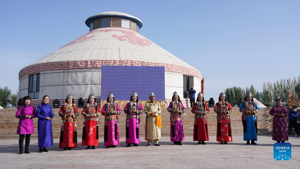 Intangible cultural heritage inheritors and folk artists chant with folk music at a scenic area of Bosten Lake in Bohu County, northwest China's Xinjiang Uygur Autonomous Region, Sept. 23, 2021. (Xinhua/Zhang Xiaocheng)