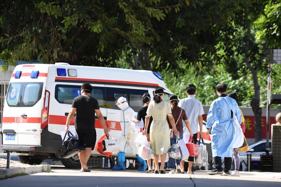 Patients recovered from COVID-19 prepare to get on an ambulance to a medical facility for rehabilitation in Xiamen, east China's Fujian Province, on Sept. 25, 2021. Seven COVID-19 patients were discharged from hospital in the city of Xiamen, east China's Fujian Province, on Saturday after recovery. (Xinhua/Jiang Kehong)