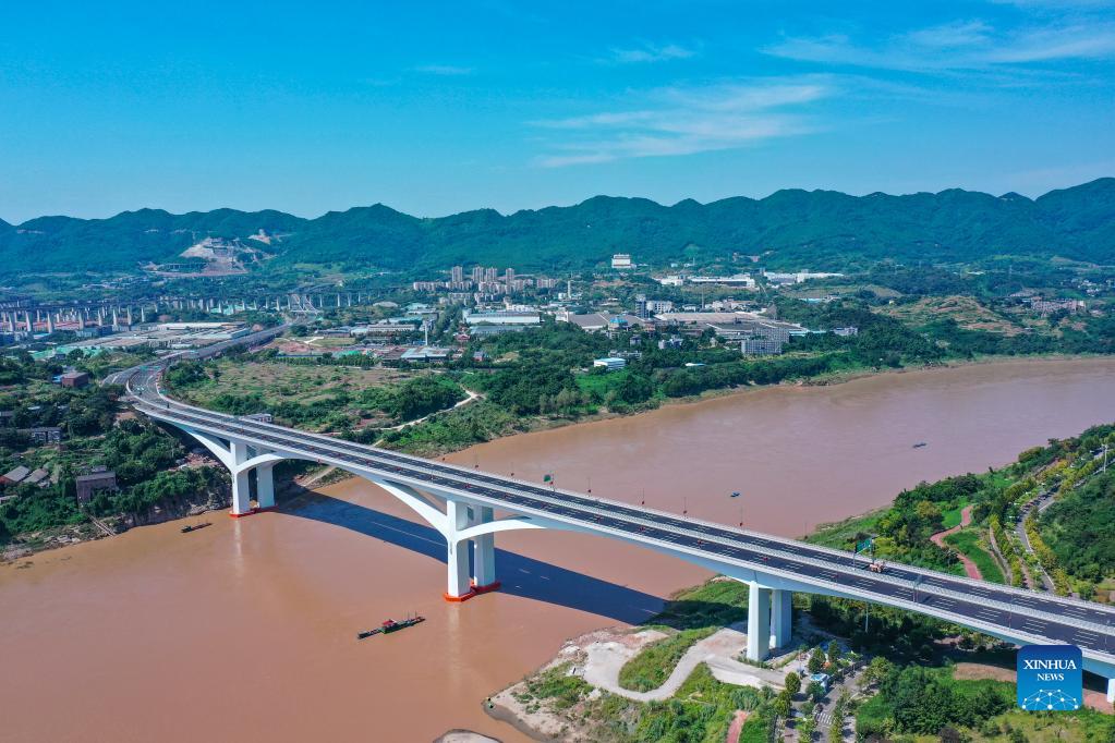 Aerial photo taken on Sept. 26, 2021 shows Lijia Jialing River Bridge in southwest China's Chongqing. With a total length of 785 meters, the Lijia Jialing River Bridge is expected to start operation before the upcoming National Day holiday. (Xinhua/Huang Wei)