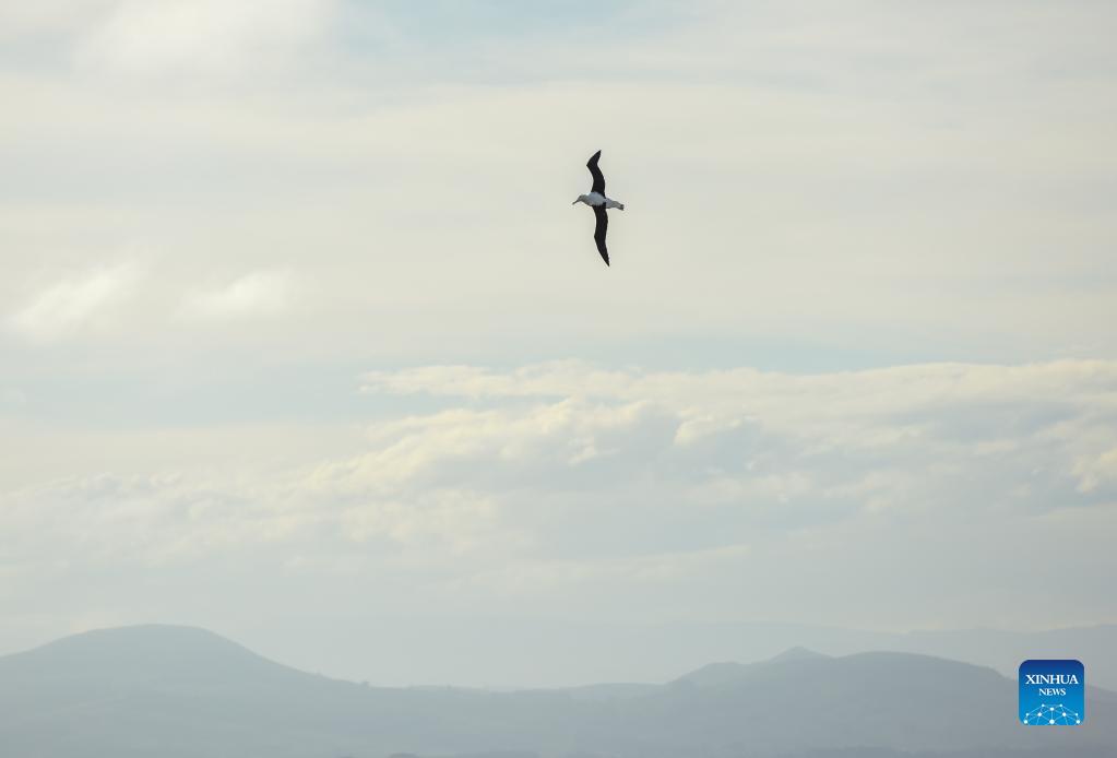 Photo taken on April 22, 2021 shows an albatross hovering around Taiaroa Head, eco-sanctuary for Northern Royal Albatross situated in South Island of New Zealand. A record number of 30 fledglings of Northern Royal Albatrosses may leave the colony after a successful breeding season in the eco-sanctuary of Taiaroa Head in Southern New Zealand, according to New Zealand Department of Conservation figures released on Sept. 25. (Xinhua/Guo Lei)