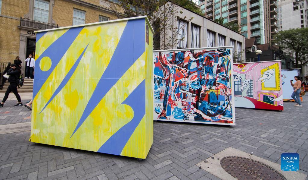 A woman looks at murals during the 2021 Yorkville Murals art festival in Toronto, Canada, on Sept. 26, 2021. (Photo by Zou Zheng/Xinhua)