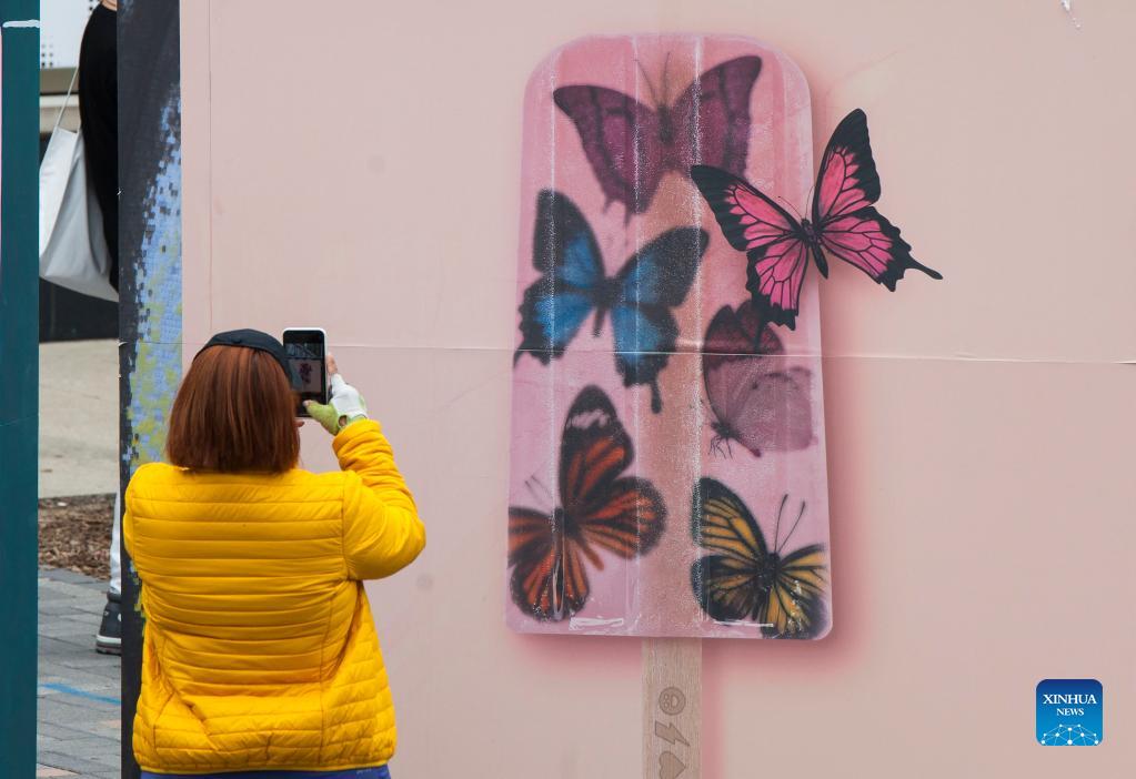 A woman takes photos of a mural during the 2021 Yorkville Murals art festival in Toronto, Canada, on Sept. 26, 2021. (Photo by Zou Zheng/Xinhua)