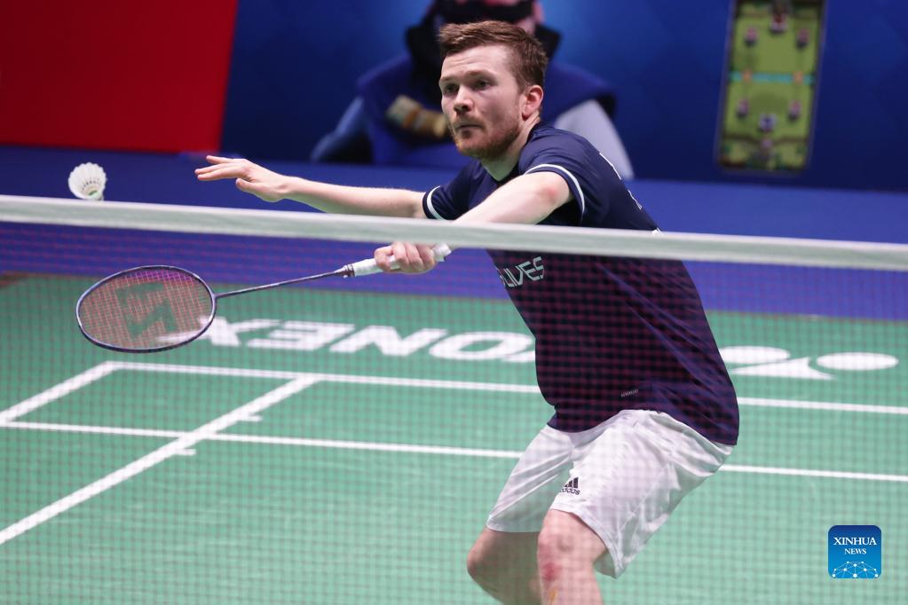 Finland's Kalle Koljonen competes against China's Lu Guangzu in the men's singles competition during the group A match between China and Finland at Badminton Surdiman Cup 2021 in Vantaa, Finland, Sept. 26, 2021. (Photo by Matti Matikainen/Xinhua)