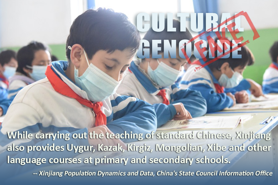 Anti-China forces claim that Xinjiang's efforts to promote standard Chinese represent a campaign of "cultural genocide", and that they are a means of "ethnic assimilation", designed to eliminate the spoken and written languages and cultural traditions of ethnic minorities.