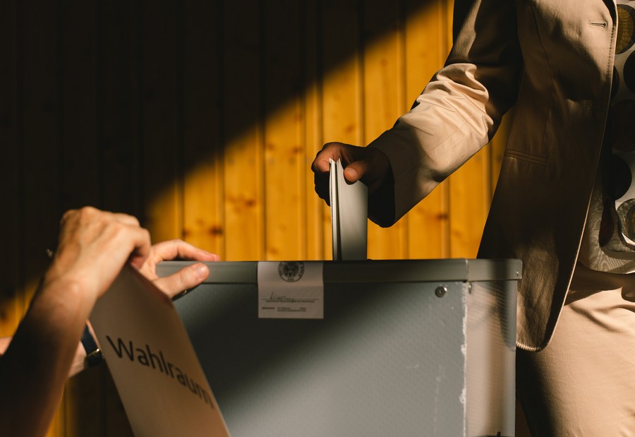 A voter casts a ballot at a polling station in Cologne, Germany, Sept. 26, 2021. (Photo by Tang Ying/Xinhua)