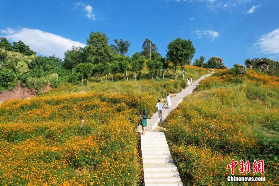 An old residential building is surrounded by a golden sea of coreopsis flowers, drawing people to take snaps, in Nanan District, China’s Chongqing Municipality. (China News Service/Yin Yuan)